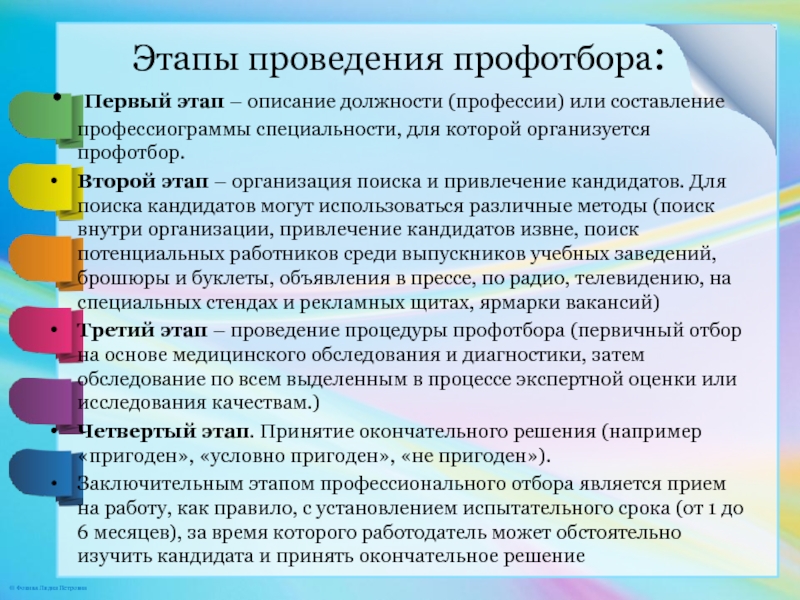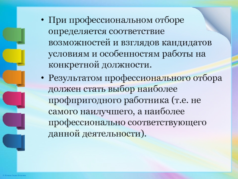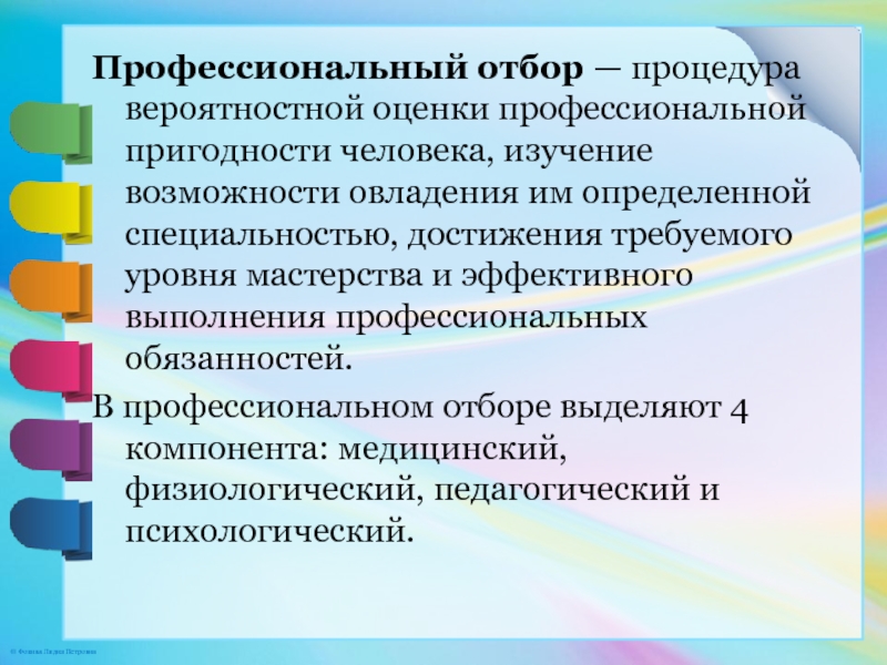 Слайд 20Профессиональный отбор — процедура вероятностной оценки профессиональной пригодности человека, изучение возможности овладения им определенной