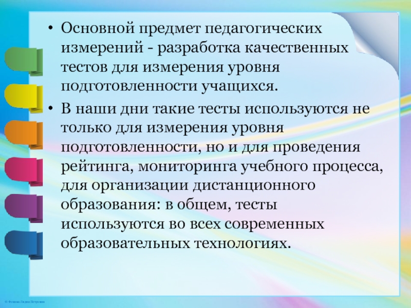 Слайд 5Основной предмет педагогических измерений - разработка качественных тестов для измерения уровня подготовленности