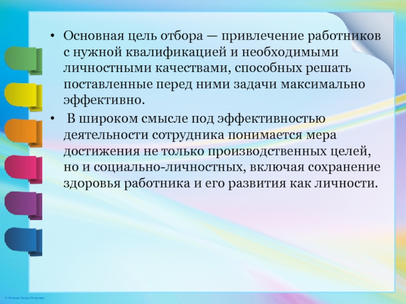 Слайд 21Основная цель отбора — привлечение работников с нужной квалификацией и необходимыми