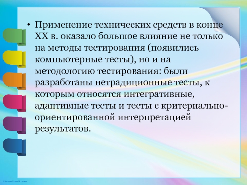 только на методы тестирования (появились компьютерные тесты), но и на методологию тестирования: были разработаны нетрадиционные тесты, к которым относятся интегративные, адаптивные тесты и тесты с критериально-ориентированной интерпретацией результатов.