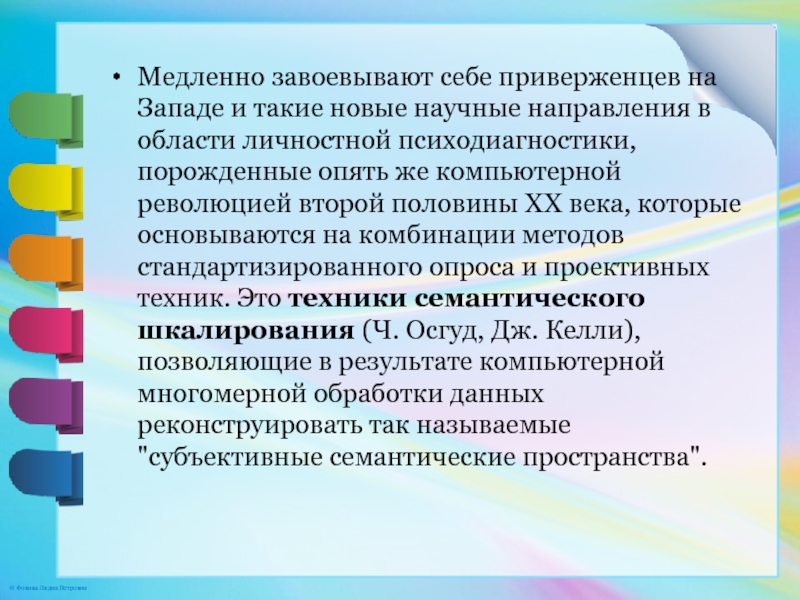 в области личностной психодиагностики, порожденные опять же компьютерной революцией второй половины XX века, которые основываются на комбинации методов стандартизированного опроса и проективных техник. Это техники семантического шкалирования (Ч. Осгуд, Дж. Келли), позволяющие в результате компьютерной многомерной обработки данных реконструировать так называемые "субъективные семантические пространства".