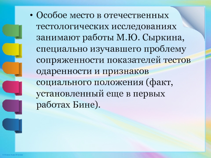 Слайд 18Особое место в отечественных тестологических исследованиях занимают работы М.Ю. Сыркина, специально