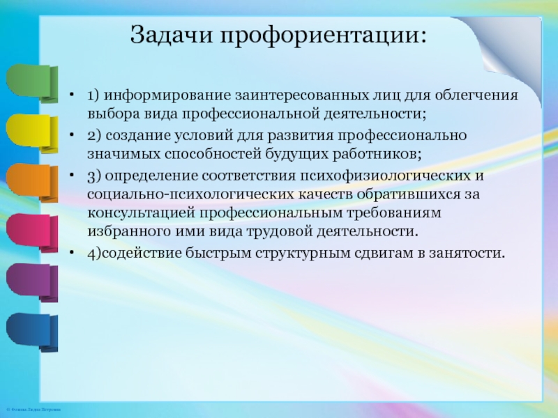 Цели профориентации: оказание помощи молодым людям и людям, ищущим работу, в выборе профессии, специальности, места работы или учебы с учетом склонностей и интересов людей, их психофизиологических особенностей, а также с учетом складывающейся конъюнктуры рынка труда.
