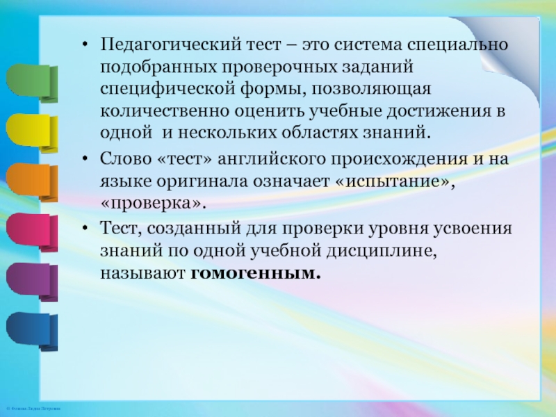 Слайд 6Педагогический тест – это система специально подобранных проверочных заданий специфической формы,