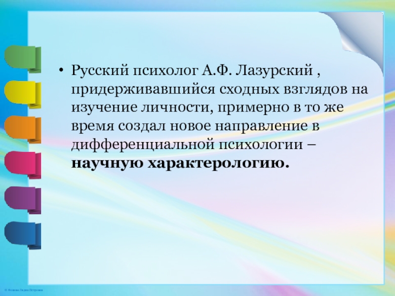 Слайд 16Русский психолог А.Ф. Лазурский , придерживавшийся сходных взглядов на изучение личности,