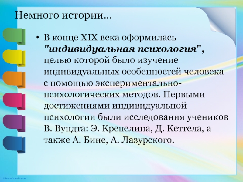 изучение индивидуальных особенностей человека с помощью экспериментально-психологических методов. Первыми достижениями индивидуальной психологии были исследования учеников В. Вундта: Э. Крепелина, Д. Кеттела, а также А. Бине, А. Лазурского.
