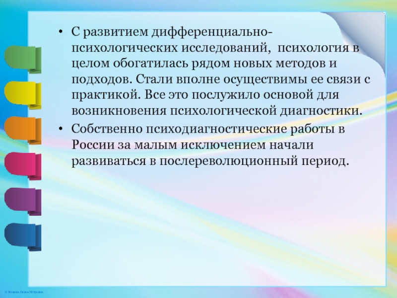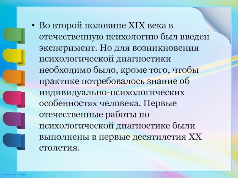 Собственно психодиагностические работы в России за малым исключением начали развиваться в послереволюционный период.