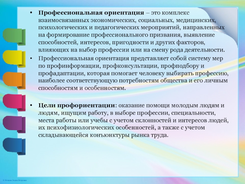 Слайд 26Профессиональная ориентация – это комплекс взаимосвязанных экономических, социальных, медицинских, психологических и