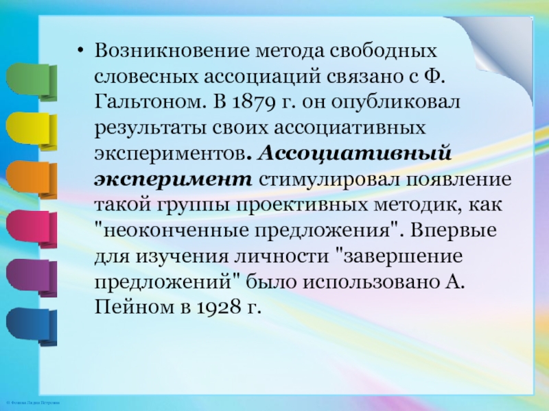 Слайд 11Возникновение метода свободных словесных ассоциаций связано с Ф. Гальтоном. В 1879