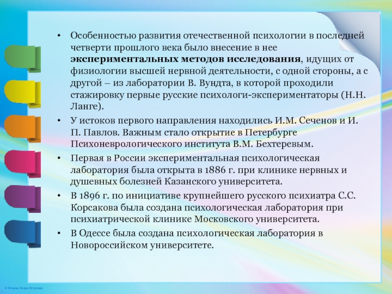 в нее экспериментальных методов исследования, идущих от физиологии высшей нервной деятельности, с одной стороны, а с другой – из лаборатории В. Вундта, в которой проходили стажировку первые русские психологи-экспериментаторы (Н.Н. Ланге).