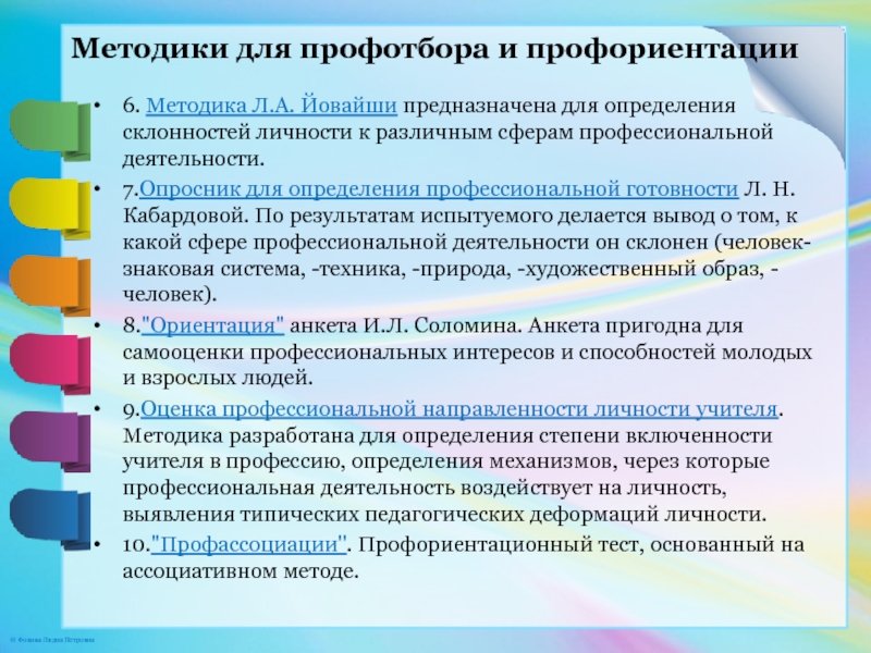 8."Ориентация" анкета И.Л. Соломина. Анкета пригодна для самооценки профессиональных интересов и способностей молодых и взрослых людей.
