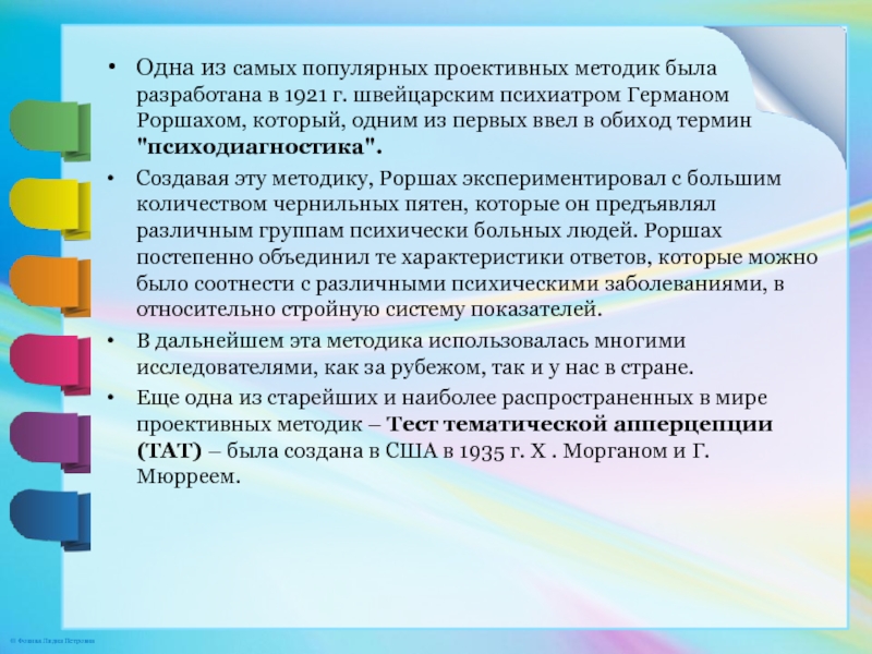 Слайд 12Одна из самых популярных проективных методик была разработана в 1921 г.