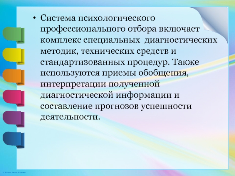 Слайд 24Система психологического профессионального отбора включает комплекс специальных диагностических методик, технических средств