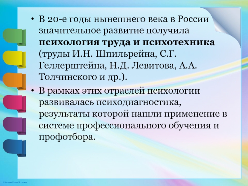 труда и психотехника (труды И.Н. Шпильрейна, С.Г. Геллерштейна, Н.Д. Левитова, А.А. Толчинского и др.).