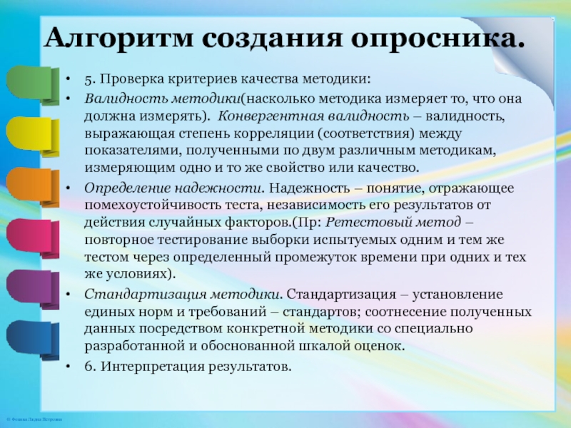 Стандартизация методики. Стандартизация – установление единых норм и требований – стандартов; соотнесение полученных данных посредством конкретной методики со специально разработанной и обоснованной шкалой оценок.