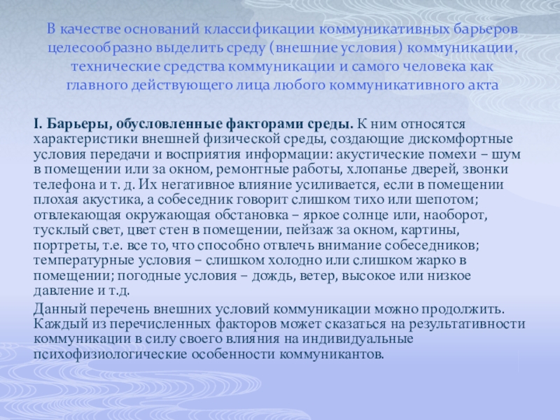 Слайд 2В качестве оснований классификации коммуникативных барьеров целесообразно выделить среду (внешние условия)