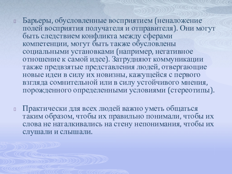 Слайд 14Барьеры, обусловленные восприятием (неналожение полей восприятия получателя и отправителя). Они могут
