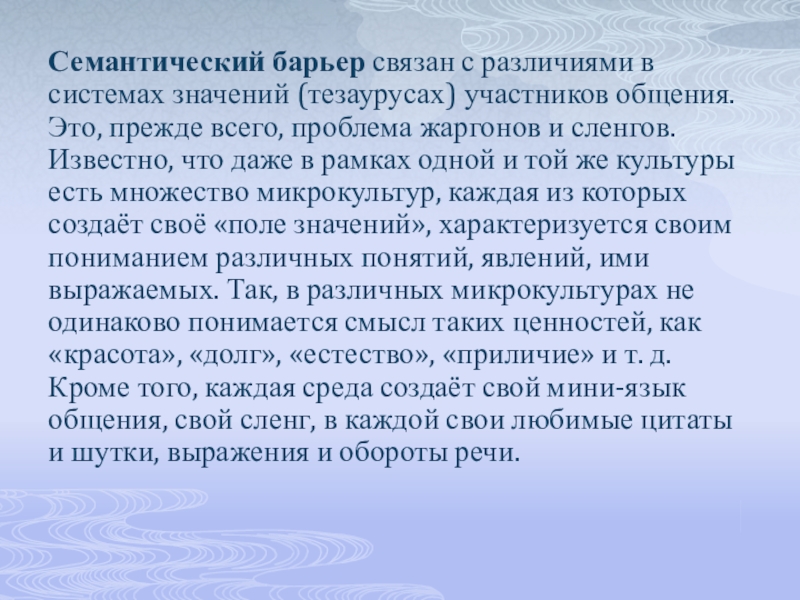Слайд 6Семантический барьер связан с различиями в системах значений (тезаурусах) участников общения.