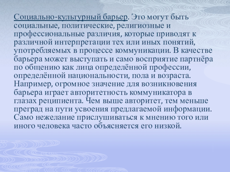 которые приводят к различной интерпретации тех или иных понятий, употребляемых в процессе коммуникации. В качестве барьера может выступать и само восприятие партнёра по общению как лица определённой профессии, определённой национальности, пола и возраста. Например, огромное значение для возникновения барьера играет авторитетность коммуникатора в глазах реципиента. Чем выше авторитет, тем меньше преград на пути усвоения предлагаемой информации. Само нежелание прислушиваться к мнению того или иного человека часто объясняется его низкой.