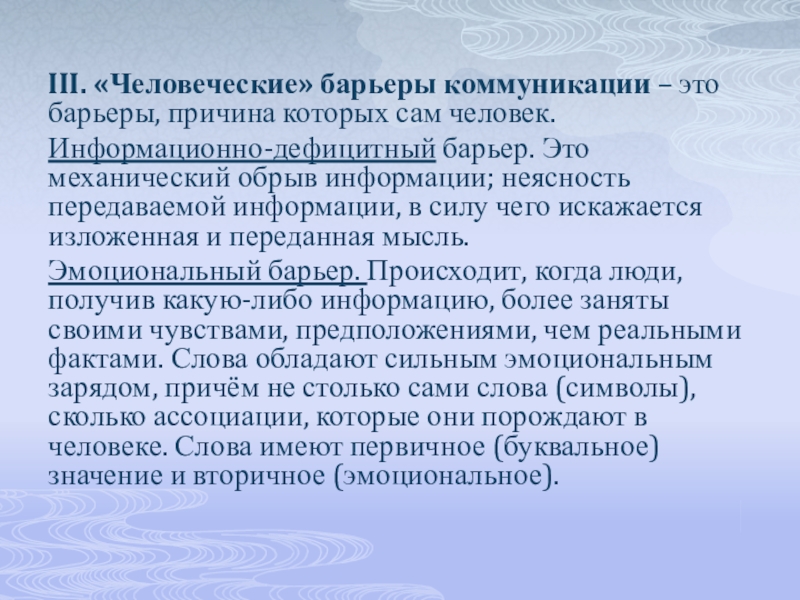 Слайд 4III. «Человеческие» барьеры коммуникации – это барьеры, причина которых сам человек.