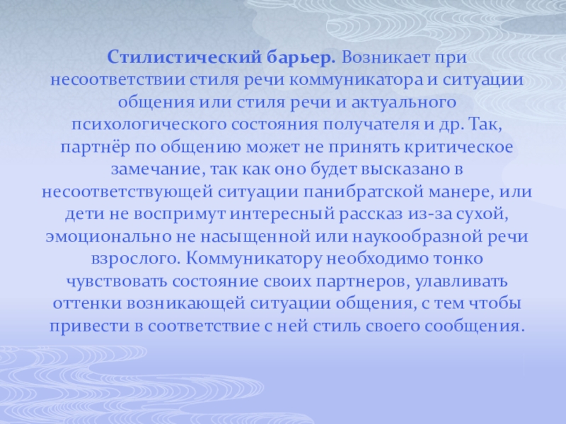 Слайд 7Стилистический барьер. Возникает при несоответствии стиля речи коммуникатора и ситуации общения