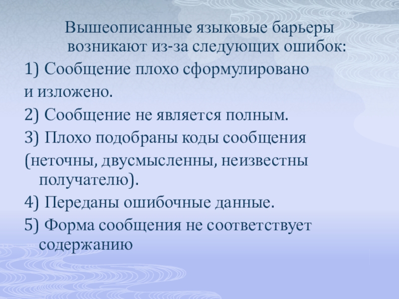 Слайд 8Вышеописанные языковые барьеры возникают из-за следующих ошибок: