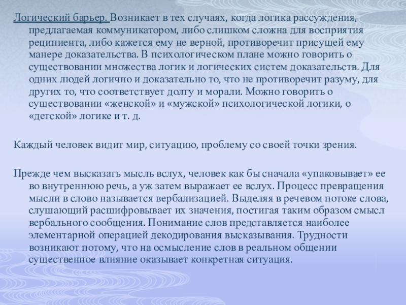 Слайд 12Логический барьер. Возникает в тех случаях, когда логика рассуждения, предлагаемая коммуникатором,