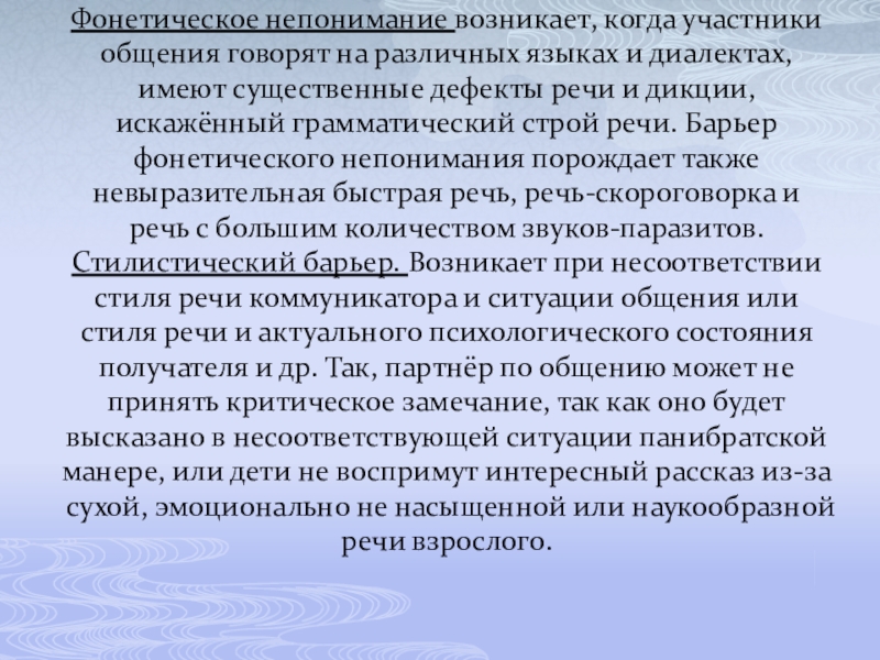 диалектах, имеют существенные дефекты речи и дикции, искажённый грамматический строй речи. Барьер фонетического непонимания порождает также невыразительная быстрая речь, речь-скороговорка и речь с большим количеством звуков-паразитов.