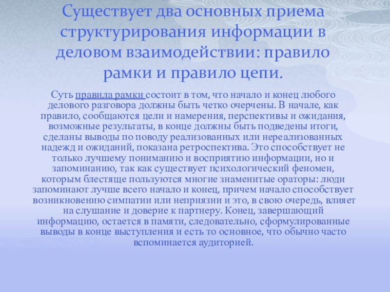 Слайд 9Существует два основных приема структурирования информации в деловом взаимодействии: правило рамки