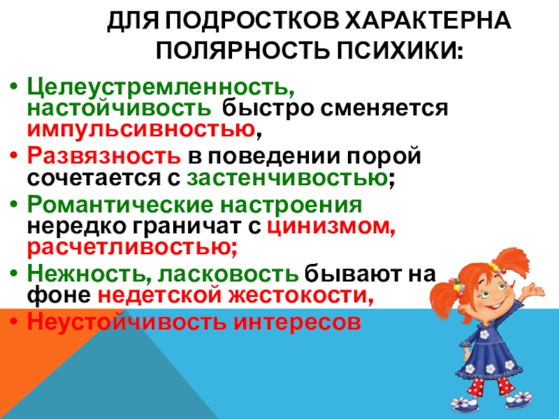 Слайд 6ДЛЯ ПОДРОСТКОВ ХАРАКТЕРНА ПОЛЯРНОСТЬ ПСИХИКИ:
