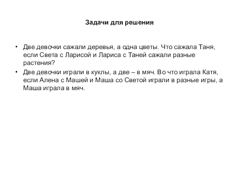 Две девочки играли в куклы, а две – в мяч. Во что играла Катя, если Алена с Машей и Маша со Светой играли в разные игры, а Маша играла в мяч.