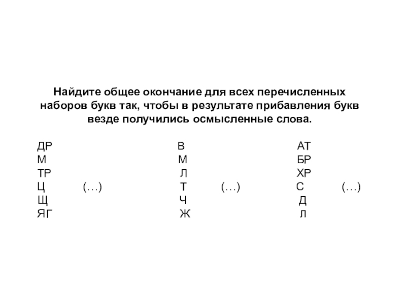 Слайд 32Найдите общее окончание для всех перечисленных наборов букв так, чтобы в