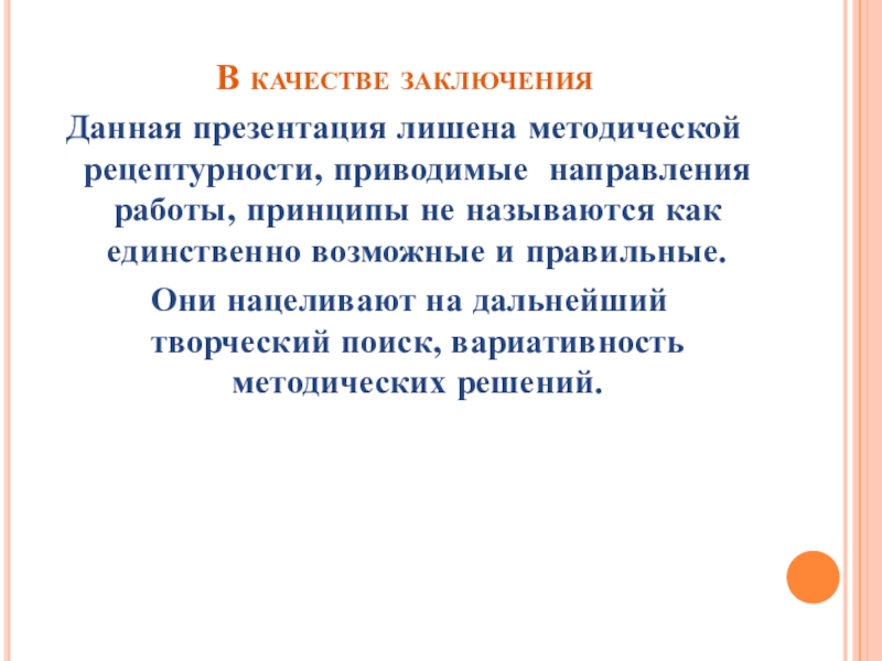 Они нацеливают на дальнейший творческий поиск, вариативность методических решений.