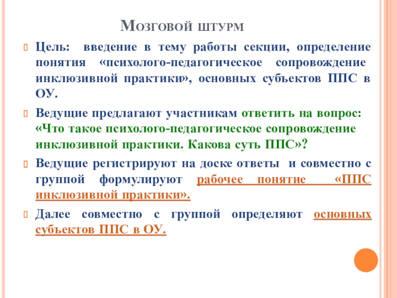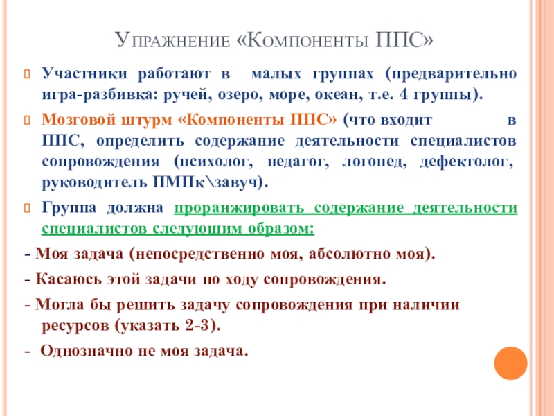 Мозговой штурм «Компоненты ППС» (что входит в ППС, определить содержание деятельности специалистов сопровождения (психолог, педагог, логопед, дефектолог, руководитель ПМПк\завуч).