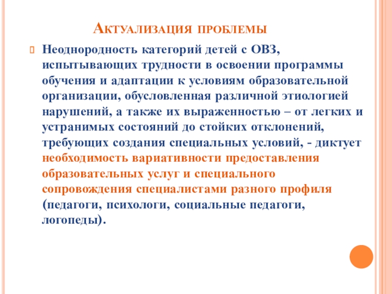 обучения и адаптации к условиям образовательной организации, обусловленная различной этиологией нарушений, а также их выраженностью – от легких и устранимых состояний до стойких отклонений, требующих создания специальных условий, - диктует необходимость вариативности предоставления образовательных услуг и специального сопровождения специалистами разного профиля (педагоги, психологи, социальные педагоги, логопеды).