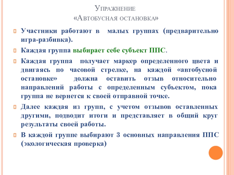 Каждая группа получает маркер определенного цвета и двигаясь по часовой стрелке, на каждой «автобусной остановке» должна оставить отзыв относительно направлений работы с определенным субъектом, пока группа не вернется к своей отправной точке.