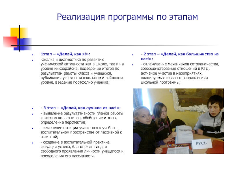 2. Высший орган РВО – сбор коллектива по классам. Исполнительный орган-совет старшеклассников, который решает и организует важнейшие дела отряда и КТД. В совет старшеклассников входят по два человека из класса старшего звена. Руководство РВО «Русь» осуществляется через классных руководителей, заместителя директора по воспитательной работе