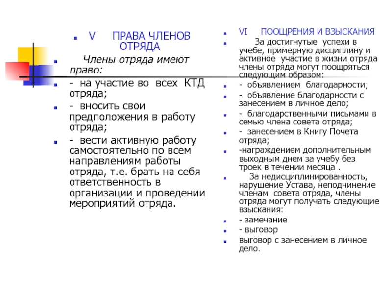 За достигнутые успехи в учебе, примерную дисциплину и активное участие в жизни отряда члены отряда могут поощряться следующим образом: