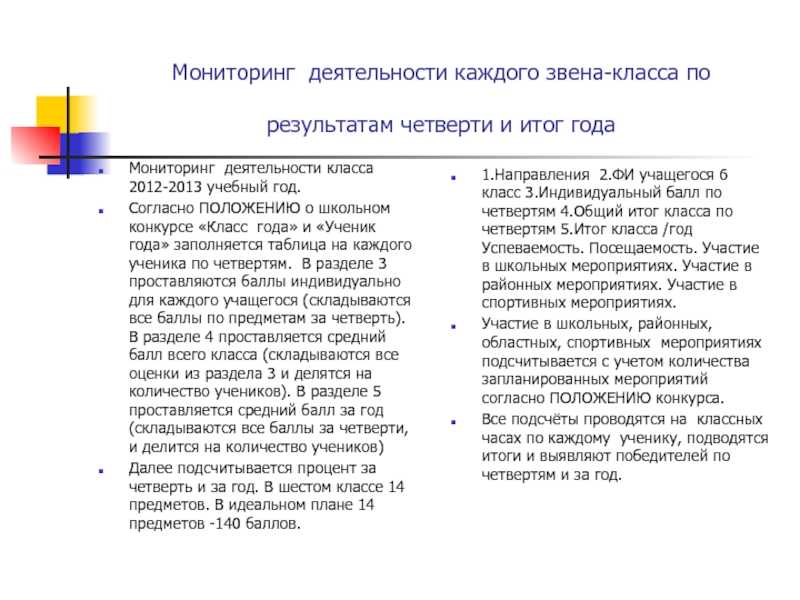 1.Направления 2.ФИ учащегося 6 класс 3.Индивидуальный балл по четвертям 4.Общий итог класса по четвертям 5.Итог класса /год Успеваемость. Посещаемость. Участие в школьных мероприятиях. Участие в районных мероприятиях. Участие в спортивных мероприятиях.