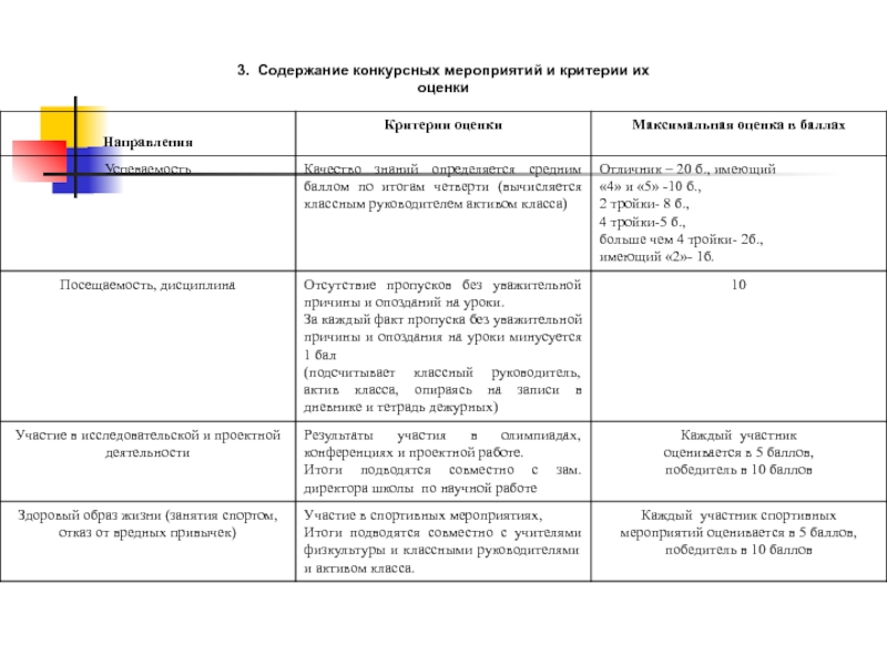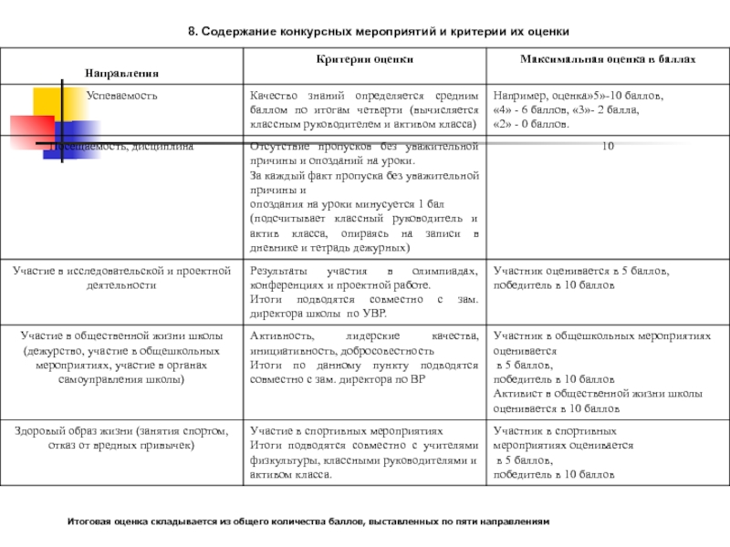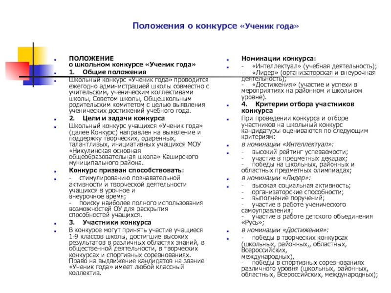 При проведении конкурса и отборе участников на школьный конкурс кандидатуры оцениваются по следующим критериям: