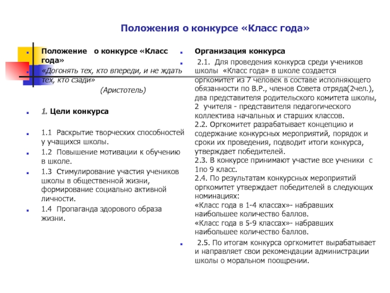 2.1. Для проведения конкурса среди учеников школы «Класс года» в школе создается оргкомитет из 7 человек в составе исполняющего обязанности по В.Р., членов Совета отряда(2чел.), два представителя родительского комитета школы, 2 учителя - представителя педагогического коллектива начальных и старших классов. 2.2. Оргкомитет разрабатывает концепцию и содержание конкурсных мероприятий, порядок и сроки их проведения, подводит итоги конкурса, утверждает победителей. 2.3. В конкурсе принимают участие все ученики с 1по 9 класс. 2.4. По результатам конкурсных мероприятий оргкомитет утверждает победителей в следующих номинациях: «Класс года в 1-4 классах»- набравших наибольшее количество баллов. «Класс года в 5-9 классах»- набравших наибольшее количество баллов.