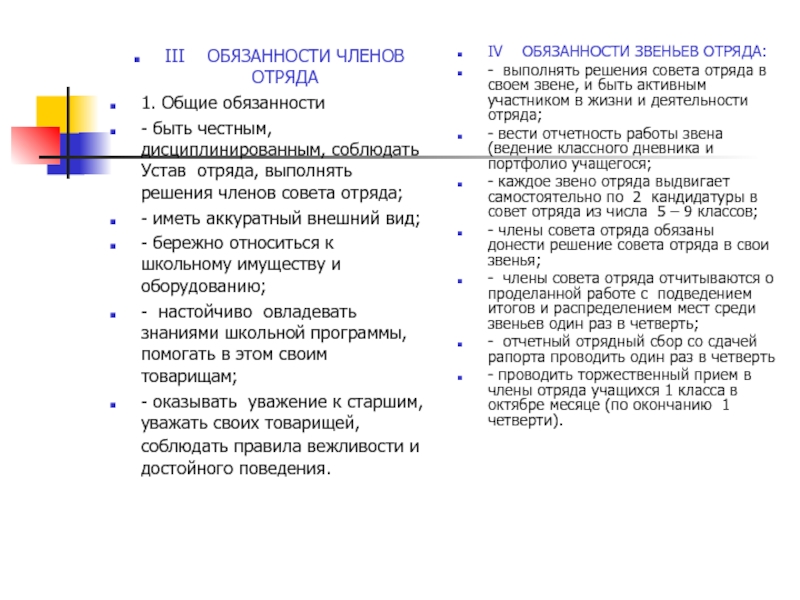 IV ОБЯЗАННОСТИ ЗВЕНЬЕВ ОТРЯДА: