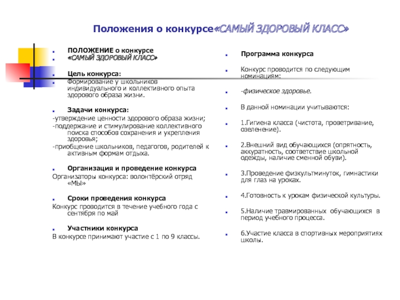 Итоги конкурса подводятся по окончании месячника здоровья (11 мая).Класс представляет отчет в жюри конкурса, который оформляется в произвольной форме. На подведении итогов класс представляет творческий отчет о проделанной работе по формированию здорового образа жизни в течение 3-5 минут (могут быть использованы слайды, фотографии, инсценировки, музыкальные композиции и т.д.).
