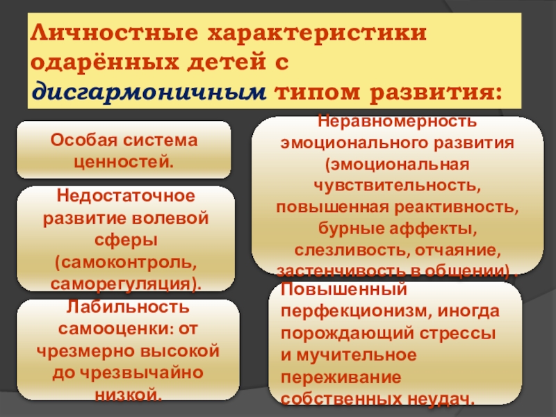 Неравномерность эмоционального развития (эмоциональная чувствительность, повышенная реактивность, бурные аффекты, слезливость, отчаяние, застенчивость в общении) .