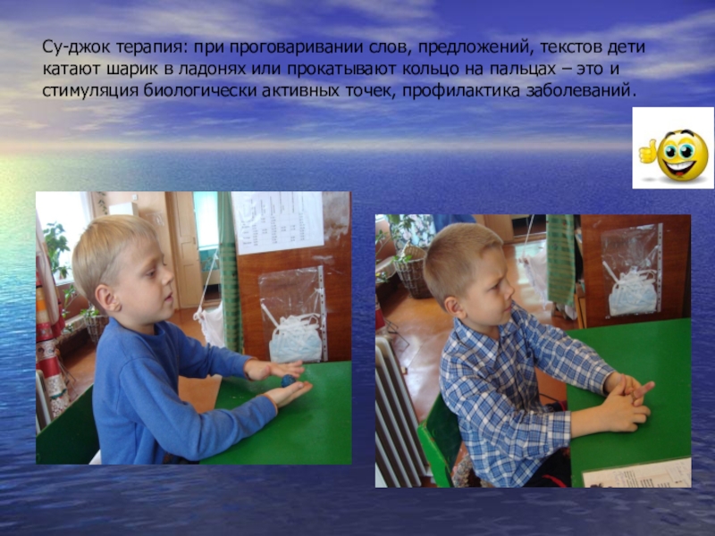 Слайд 7Су-джок терапия: при проговаривании слов, предложений, текстов дети катают шарик в