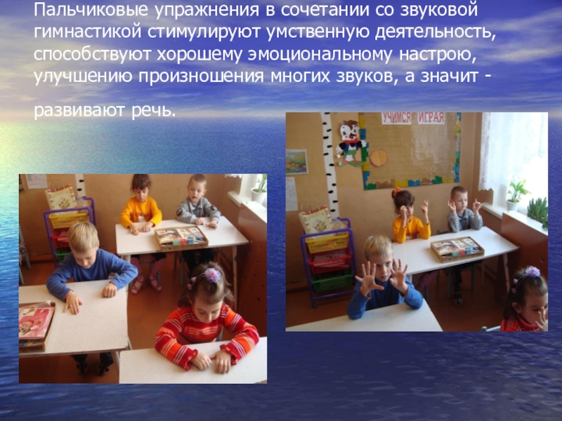 Слайд 8Пальчиковые упражнения в сочетании со звуковой гимнастикой стимулируют умственную деятельность, способствуют