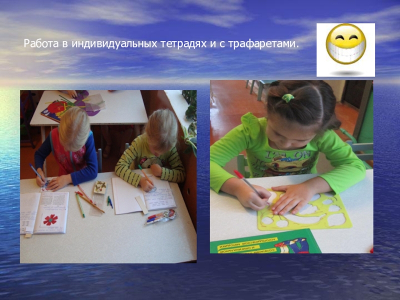 Слайд 16Работа в индивидуальных тетрадях и с трафаретами.