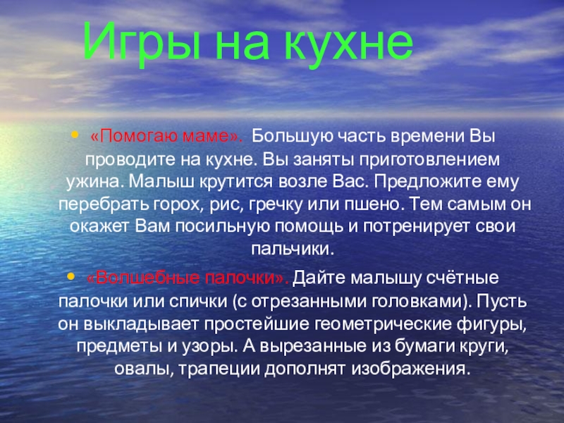 Вы заняты приготовлением ужина. Малыш крутится возле Вас. Предложите ему перебрать горох, рис, гречку или пшено. Тем самым он окажет Вам посильную помощь и потренирует свои пальчики.