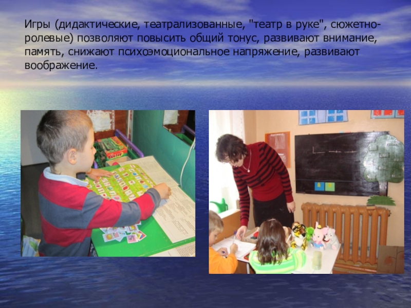 Слайд 9Игры (дидактические, театрализованные, "театр в руке", сюжетно-ролевые) позволяют повысить общий тонус,