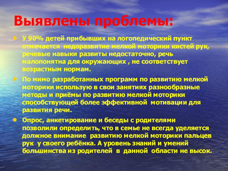 Опрос, анкетирование и беседы с родителями позволили определить, что в семье не всегда уделяется должное внимание развитию мелкой моторики пальцев рук у своего ребёнка. А уровень знаний и умений большинства из родителей в данной области не высок.